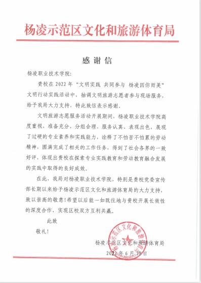 活动结束后,杨凌示范区文化旅游体育局向我校发来感谢信,对学校师生志愿者在文明旅游实践活动开展期间出色的表现表示感谢,并表示希望以后能一如既往地与学校开展长效性的深度合作,实现区校双方互利共赢。