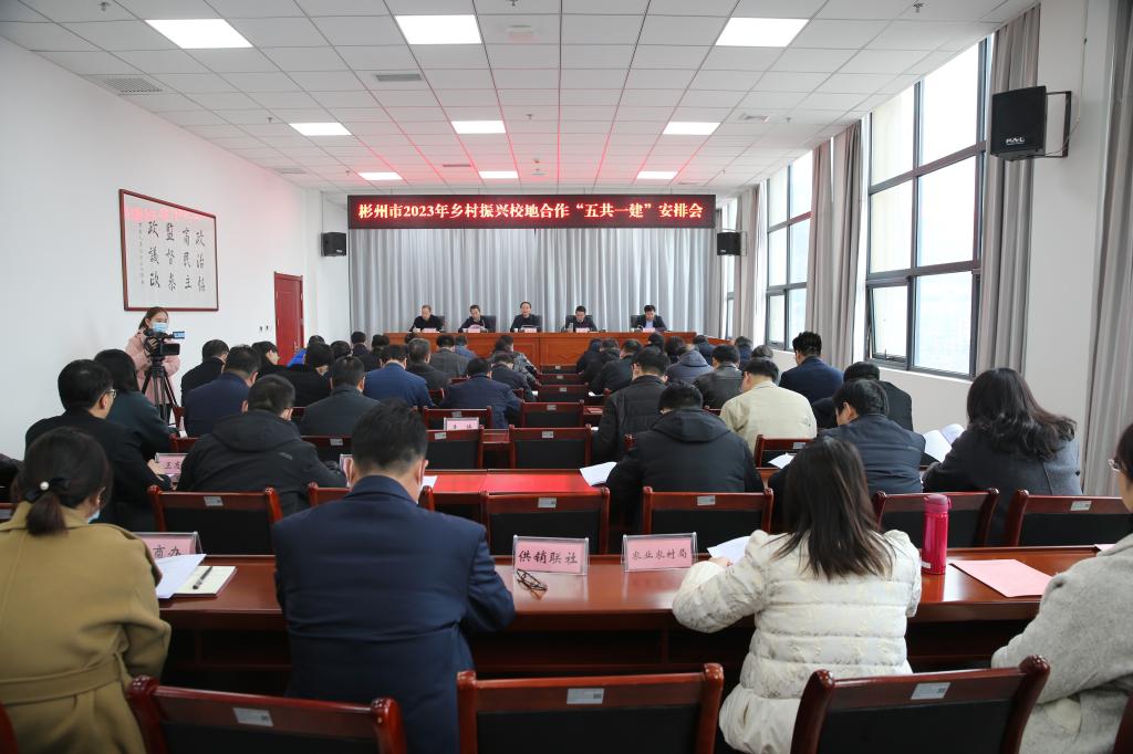 2月28日上午,彬州市召开2023年乡村振兴校地合作“五共一建”安排会我校副校长胡俊鹏,科教处处长冯旭;咸阳市乡村振兴局副局长燕志敏,彬州市市委副书记任挺、副市长石万虎参加会议。