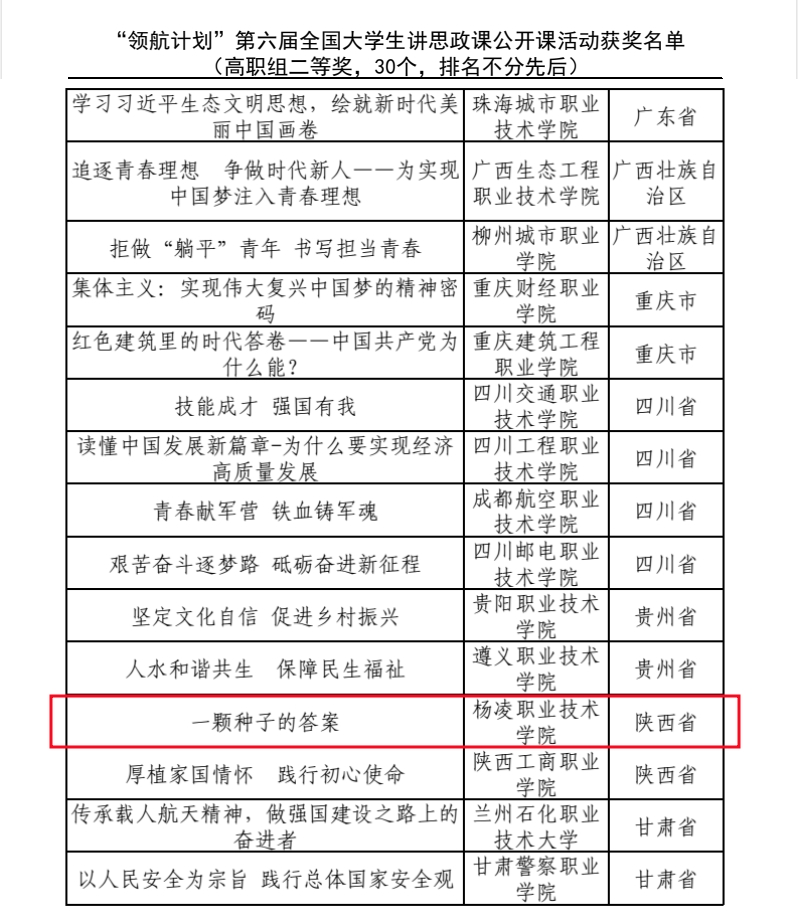 近日,由教育部高校思想政治理论课教学指导委员会主办、南开大学马克思主义学院承办的第六届全国高校大学生讲思政课公开课展示活动评选结果公布,我校学生胡雅、邓珊、王旭欣、付子扬、郭佳宝、支康的作品《一颗种子的答案》荣获全国高职组二等奖,是我校在该项赛事中的最高成绩。