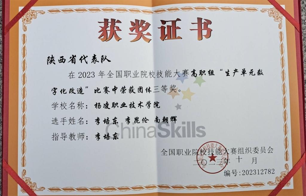 10月11日至13日,2023年全国职业院校技能大赛高职组“生产单元数字化改造(师生同赛)”赛项在天津轻工职业技术学院举办,共有来自全国30个省(市)、自治区的82支代表队、246名选手参加了本次比赛。我校教师李培东和学生李昆伦、南朝辉组成的代表队荣获三等奖。