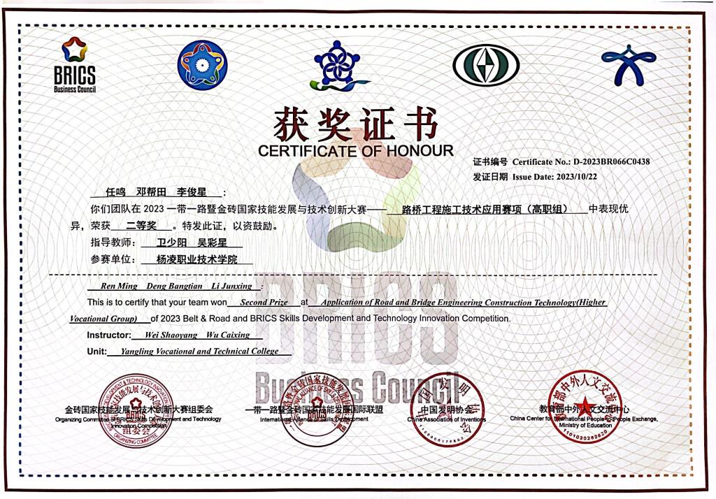 10月21日至22日,2023一带一路暨金砖国家技能发展与技术创新大赛-路桥工程施工技术应用技能竞赛决赛在西安举办,共有来自全国28个省份地区的179所院校323支队伍1500多名师生参赛。我校交通与测绘工程学院组成的两支代表队均获团体二等奖,学校获优秀组织奖,3名教师获得优秀指导教师。