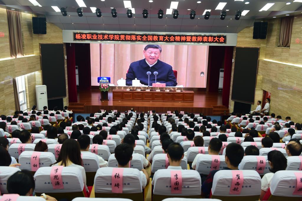 韩明军在讲话中,代表学校党委向全体教职工致以诚挚的问候,向老师们的辛勤付出和努力工作表示最崇高的敬意,向受到表彰的教师们表示热烈祝贺,并介绍了一年来学校取得的一系列标志性成果和显著发展成就。他指出,习近平总书记在全国教育大会上的重要讲话,为新时代广大教师的职业追求指明了方向、提供了根本遵循。他强调,作为教师,一是要守初心、担使命,做从教报国的践行者;二是要树品行、提能力,做立德树人的大先生;三是要抓教书、重育人,做学生成长成才的引路人;四是要挑重担、勇向前,做学校发展的推动者。希望广大教师认真学习贯彻落实全国教育大会精神,不忘初心、不辱使命,自觉维护学校形象和利益,在杨凌职院这个大舞台上,继往开来、不懈奋斗,奋力书写当代杨职人躬耕教坛的精彩答卷,努力开创学校事业发展的崭新篇章。