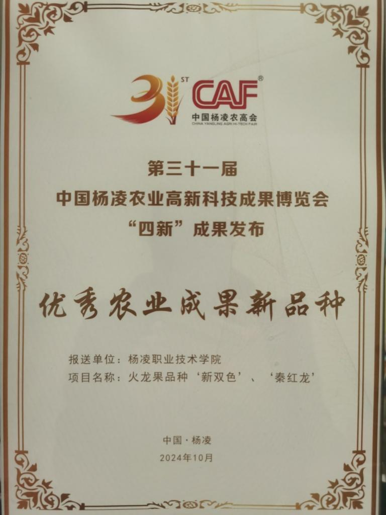10月26日,第31届中国杨凌农业高新科技成果博览会公布了“四新”成果,我校报送的火龙果品种“新双色”“秦红龙”获首届“四新”农业成果新品种优秀奖。学校火龙果产业研发中心主任、副教授牛永浩博士参加成果发布会,并做成果推介。