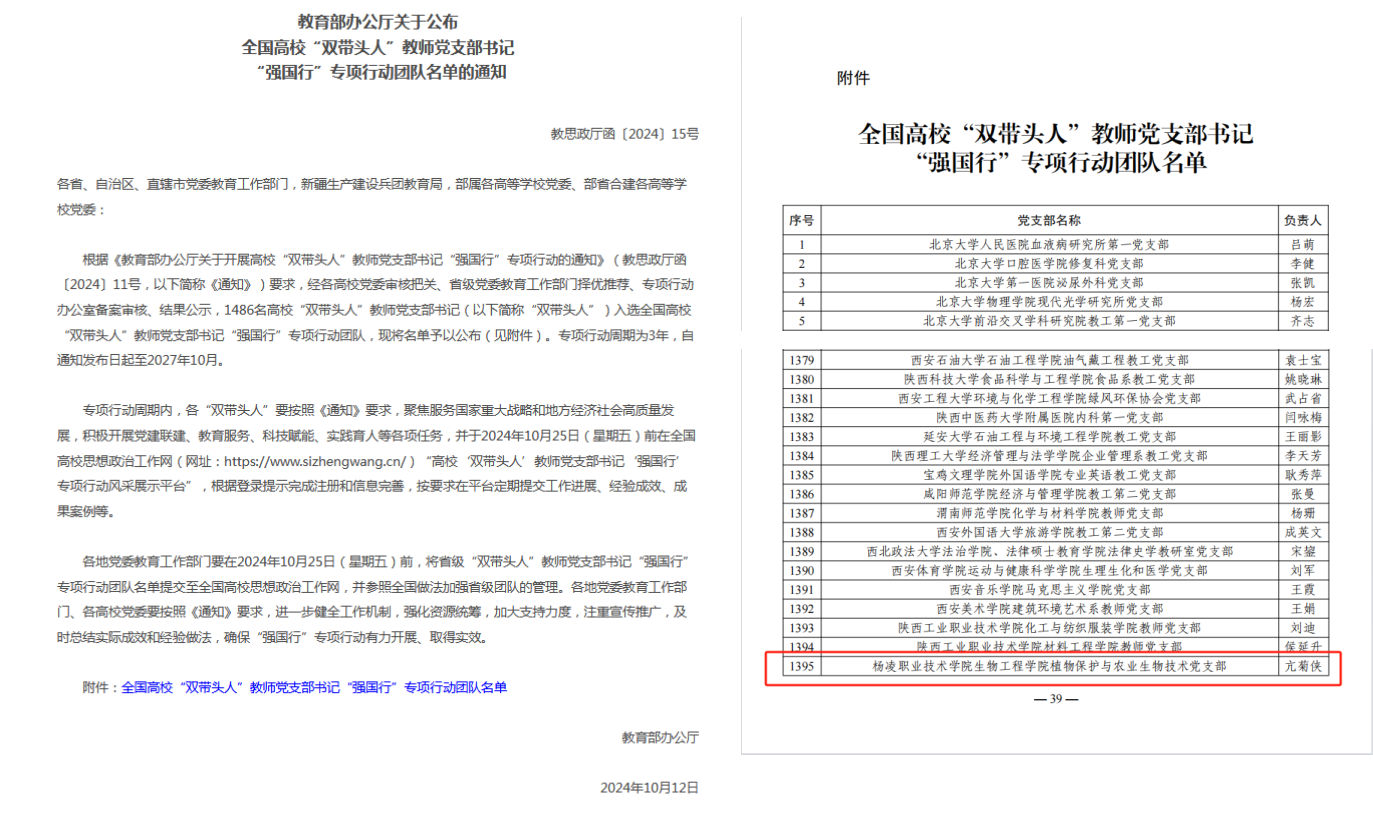 近日,教育部办公厅公布了全国高校“双带头人”教师党支部书记“强国行”专项行动创建评审结果,生物工程学院植保生技党支部成功入选。