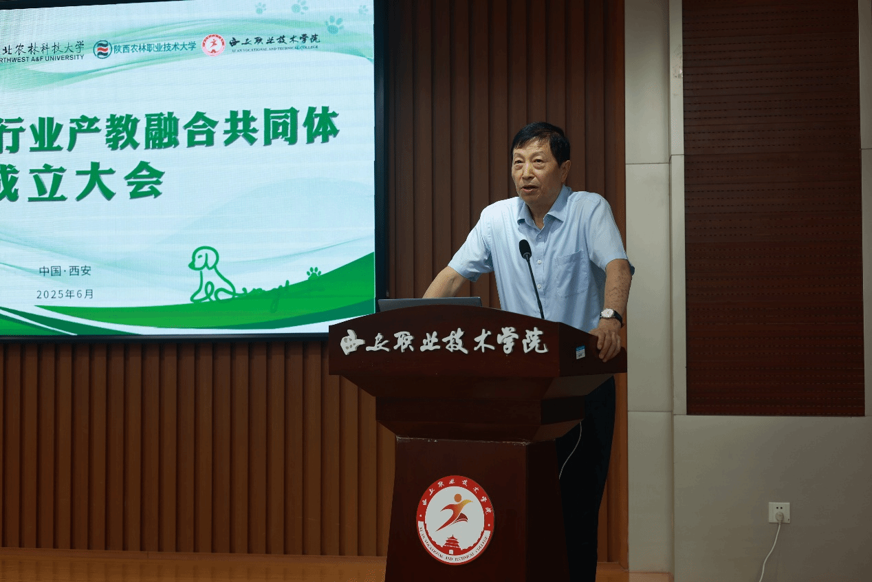 在成立大会上,祝战斌向共同体成立表示祝贺,并分享了陕西农林职业技术大学的办学底蕴与发展成果,表示共同体成立是宠物领域职业教育创新人才培养的重要里程碑,是落实国务院深化现代职教体系建设改革和发展服务型制造的生动答卷。希望各单位充分发挥独特优势,在推动陕西、西北乃至全国宠物产业迈向高质量发展的事业中倾尽全力、深入钻研,齐心协力共同培育协同创新硕果。