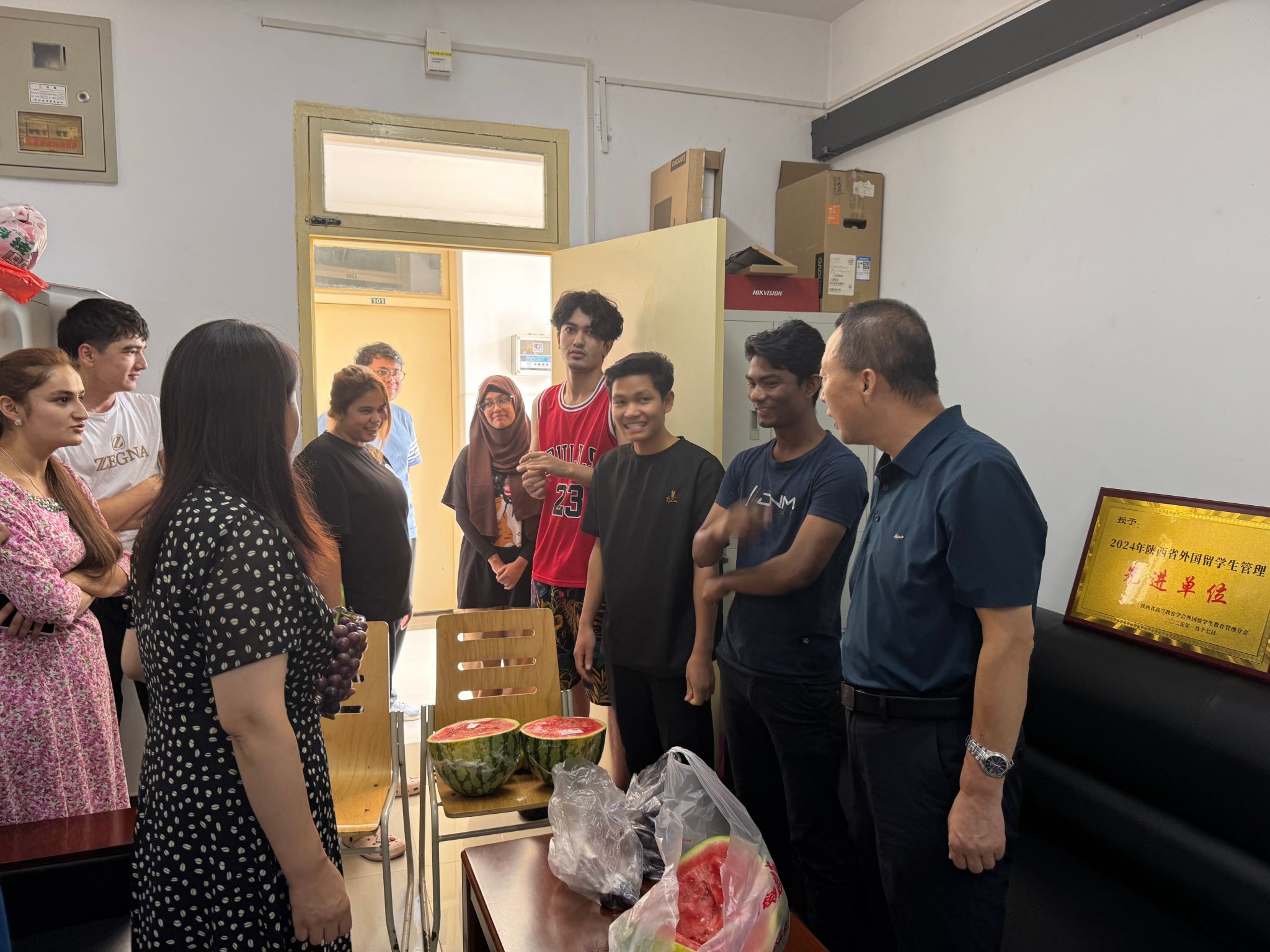 胡俊鹏与国际学生亲切交谈,深入了解了大家暑期留校的学习和生活情况。得知国际学生留校期间积极备考汉语等级考试,他代表学校给学生送上水果表示慰问,希望留学生在华留学期间学好中文和专业课,遵守学校纪律和公寓管理制度,提高安全防范意识,保障人身财产安全,度过一个平安愉快的假期。