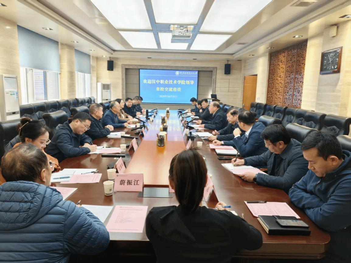 10月21日上午,汉中职业技术学院党委副书记、院长张国海,党委副书记袁力带队来校考察交流。校党委书记韩明军、校长仲伟周,党委副书记刘瑞明,副校长祝战斌出席座谈会。