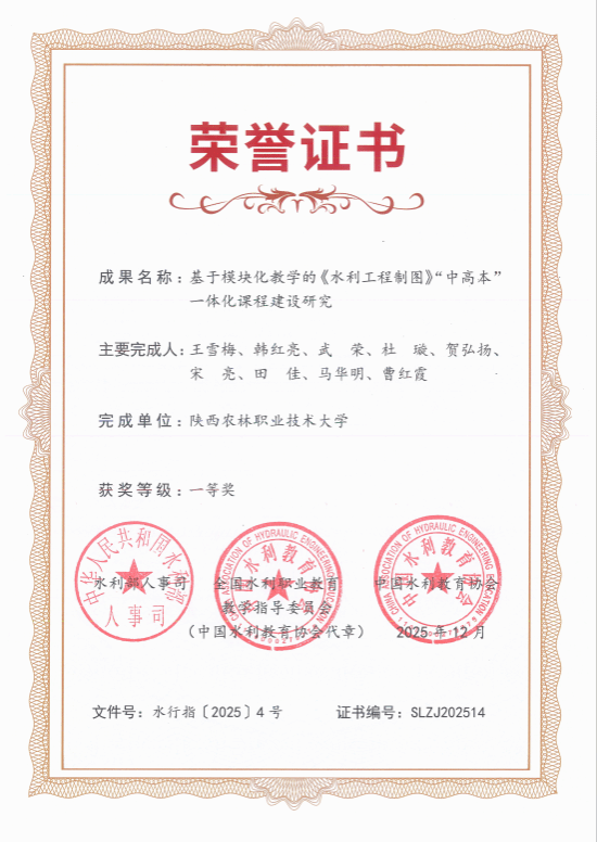 近日,2023—2025年水利职业教育研究课题验收成果获奖名单公布。我校水利工程学院院长郝红科团队的《农耕文化背景下“秦人治水”德育教育体系的构建与应用研究》荣获特等奖,青年教师王雪梅团队的《基于模块化教学的〈水利工程制图〉“中高本”一体化课程建设研究》获一等奖。