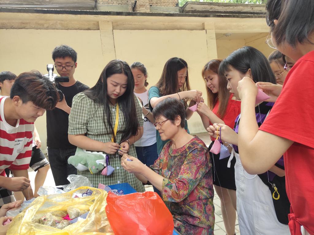 传统手工艺人屈惠珍(中)为师生现场传授包粽子、做香包
