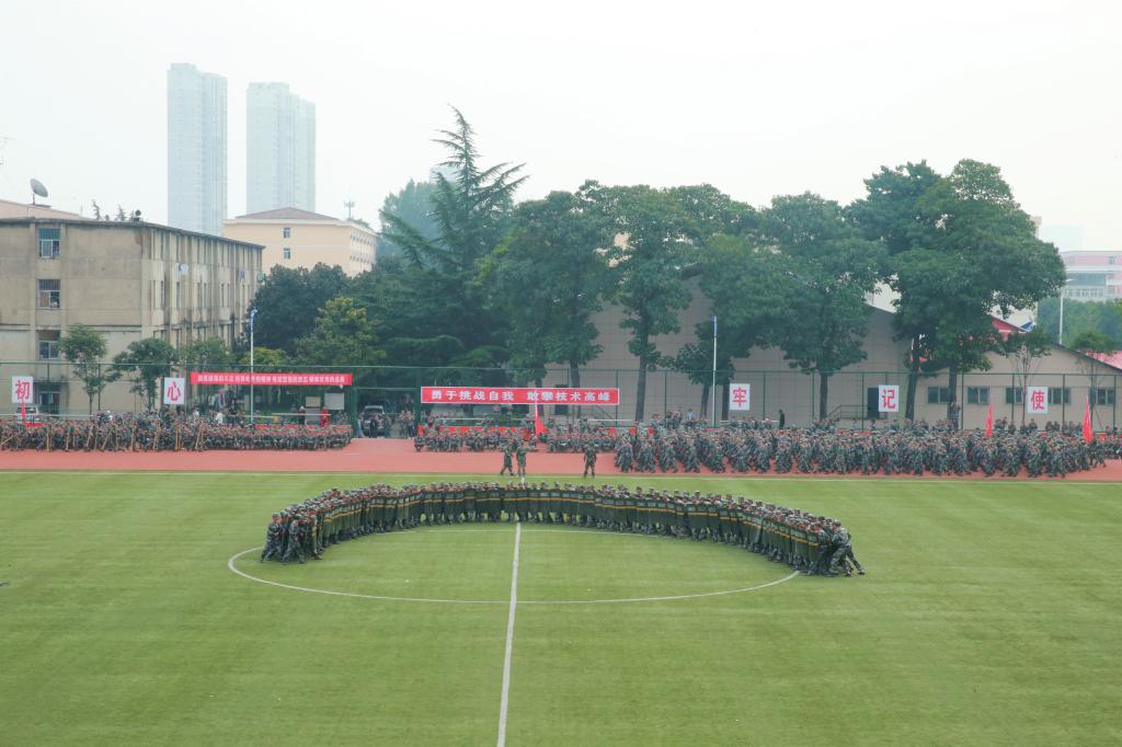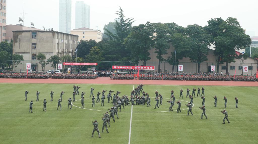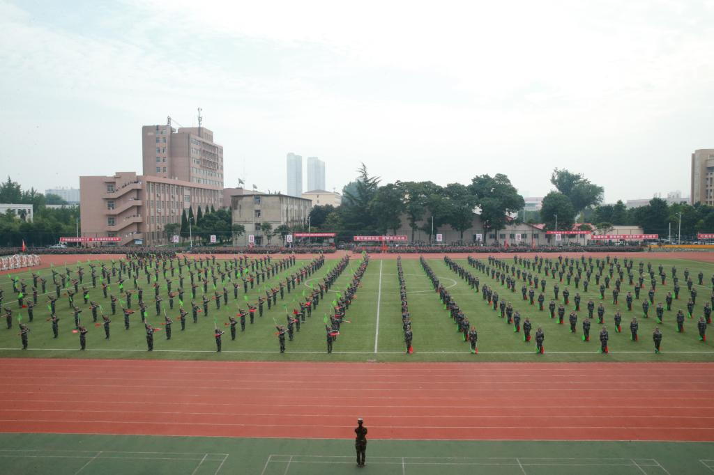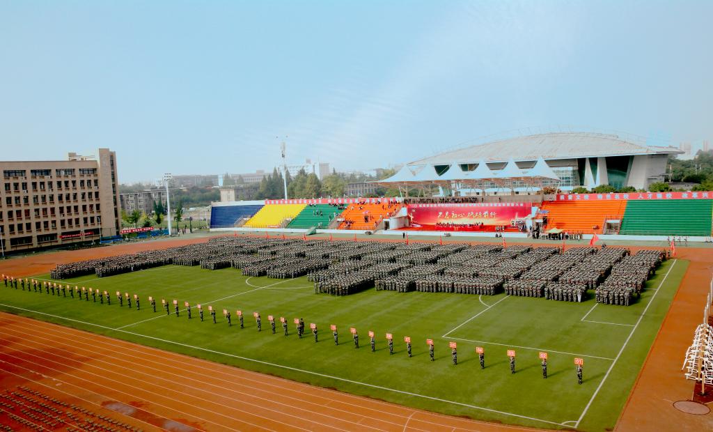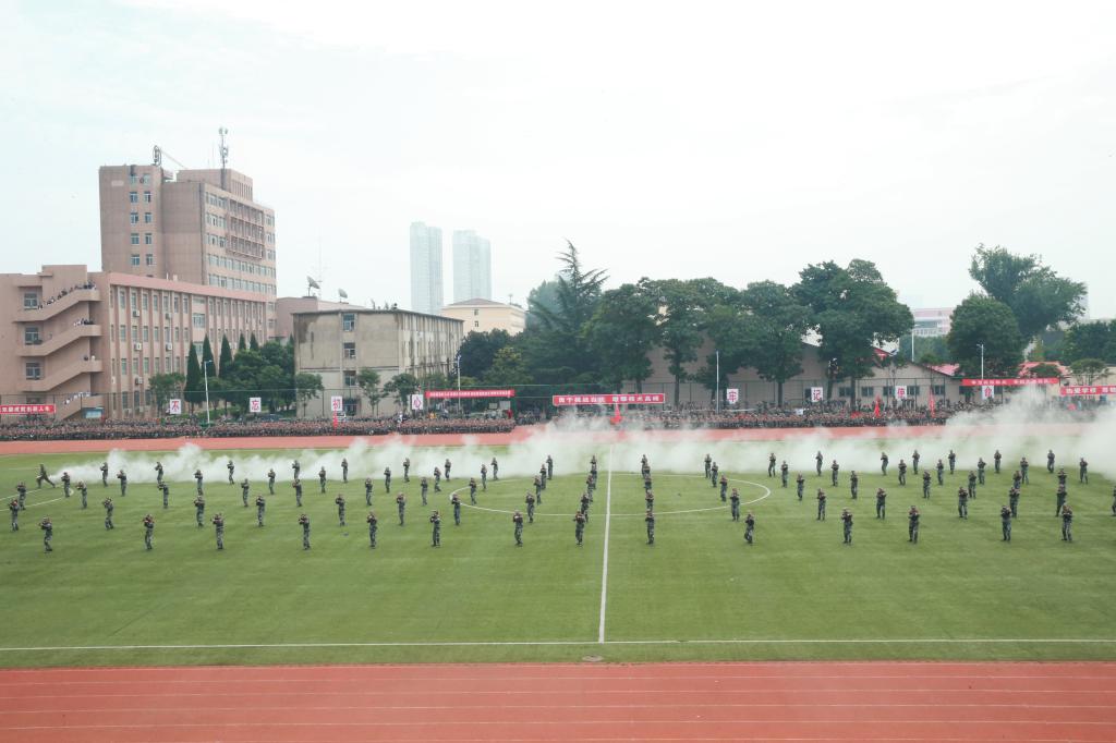 军训汇报表演暨总结表彰大会在庄严的国歌中拉开帷幕。迎军旗仪式后,学院领导和军训教官在主席台上检阅了2019级7000多名2019级新生组成的受阅方队。参训学生精神抖擞、士气高昂,包括护旗方队、辅导员方队在内的13个方队依次通过主席台,他们整齐的队列队形、矫健的步伐、标准的军姿、高昂的士气和奋发向上的精神风貌,赢得了领导和观众的阵阵掌声。阅兵式结束后,在教官们的统一指挥下,新生们分别表演了千人军体拳、刺杀操、防爆队形、旗语、战术动作和进攻战术等单项科目,展示了十四天的军训成果。