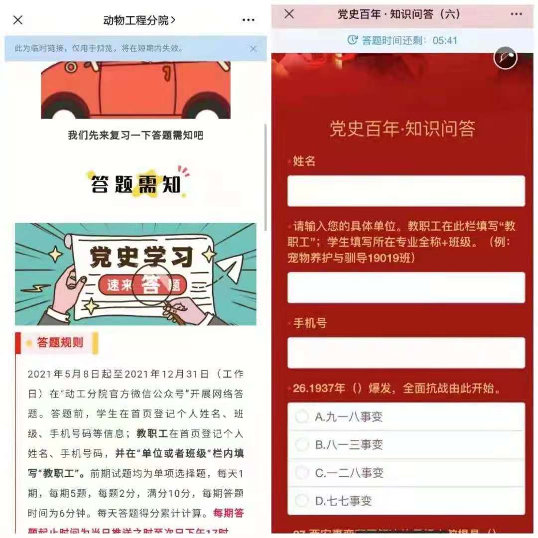 二是以线上答题竞赛为载体,推进党史学习教育往心里走动物工程学院党总支在微信公众号开设了党史学习教育专栏,开展了“党史知多少,答题见分晓”为主题的党史知识网络答题竞赛活动,每天推送1期,每期5题,每题2分,答题时限6分钟。要求全体师生积极参加答题竞赛,每两周公布一次教职工累计得分排名和学生前200名得分的排名,最终以累计得分排名,分别评出教职工和学生的一、二、三等奖,予以表彰奖励,所有参赛教职工均颁发参赛证(注明答题期数和累计得分等)和纪念品。活动开展至2021年底,计划推出200期,目前已推送7期。这一举措地实施,极大地调动了师生学习党史的积极性,广大师生参与答题竞赛的兴趣空前高涨,相互打问各自得分,随时讨论赛题答案,形成了党史学习教育比学赶帮超的浓厚氛围。