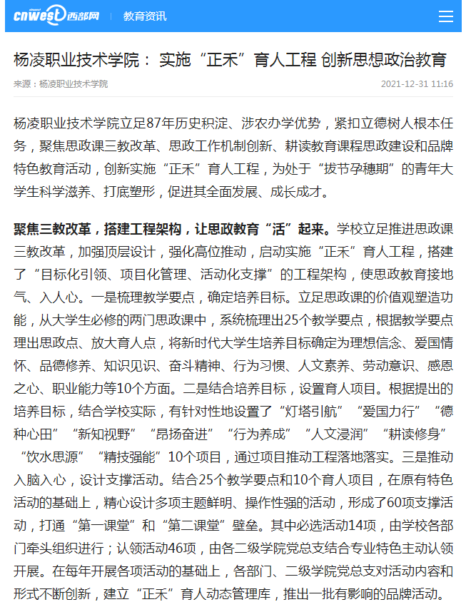 【西部网】杨凌职业技术学院: 实施“正禾”育人工程 创新思想政治教育