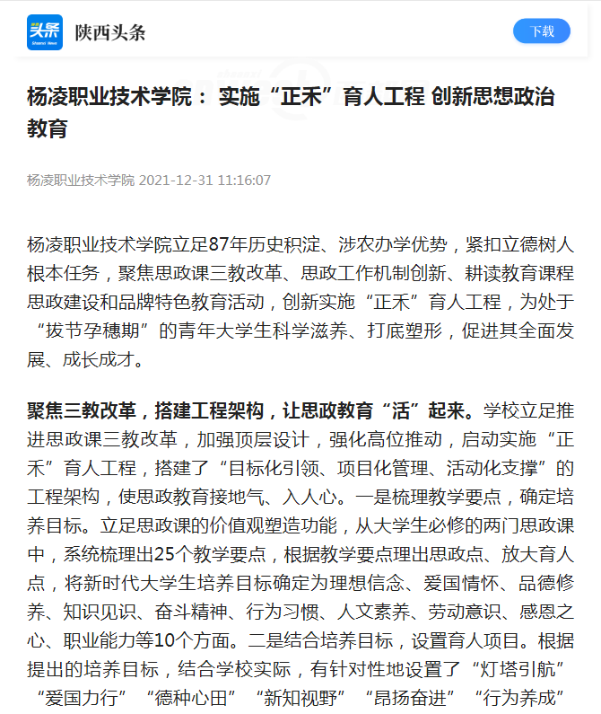 杨凌职业技术学院立足87年历史积淀、涉农办学优势,紧扣立德树人根本任务,聚焦思政课三教改革、思政工作机制创新、耕读教育课程思政建设和品牌特色教育活动,创新实施“正禾”育人工程,为处于“拔节孕穗期”的青年大学生科学滋养、打底塑形,促进其全面发展、成长成才。