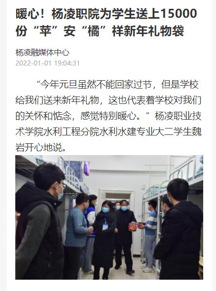 今年元旦虽然不能回家过节,但是学校给我们送来新年礼物,这也代表着学校对我们的关怀和惦念,感觉特别暖心。”杨凌职业技术学院水利工程分院水利水建专业大二学生魏岩开心地说。