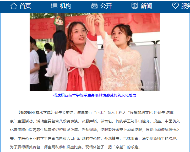 【杨凌职业技术学院】端午节前夕,该院举行“正禾”育人工程之“传播非遗文化 迎端午 送健康”主题活动。活动主要包含八段锦表演、汉服舞蹈、做香包、传统手工制作山楂丸、投壶、中医药文化宣传和中医药养生科普知识资料发放等。活动现场,汉服爱好者穿上华美汉服,展现中华传统服饰之美。中医药专业的学生在香包内放入自己研磨的中药材,外观精美,气味幽香,深受现场师生的欢迎。为了赢得精美香包,师生踊跃参加投壶比赛,现场体验了一把“穿越”的乐趣。