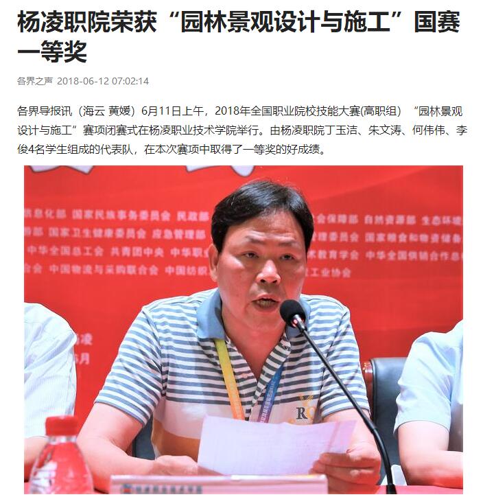 各界导报讯(海云 黄媛)6月11日上午,2018年全国职业院校技能大赛(高职组)“园林景观设计与施工”赛项闭赛式在杨凌职业技术学院举行。由杨凌职院丁玉洁、朱文涛、何伟伟、李俊4名学生组成的代表队,在本次赛项中取得了一等奖的好成绩。