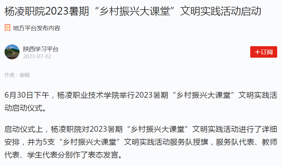 6月30日下午,杨凌职业技术学院举行2023暑期“乡村振兴大课堂”文明实践活动启动仪式。