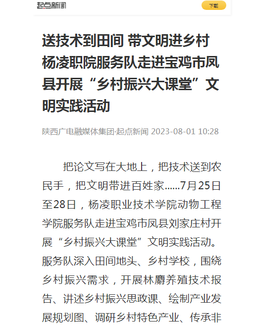 把论文写在大地上,把技术送到农民手,把文明带进百姓家......7月25日至28日,动物工程学院服务队走进宝鸡市凤县刘家庄村开展“乡村振兴大课堂”文明实践活动。服务队深入田间地头、乡村学校,围绕乡村振兴需求,开展林麝养殖技术报告、讲述乡村振兴思政课、绘制产业发展规划图、调研乡村特色产业、传承非遗文化、关爱留守儿童、看望驻村老党员和困难户等活动,在助推乡村绿色发展、服务乡村文化建设等方面践行责任担当。
