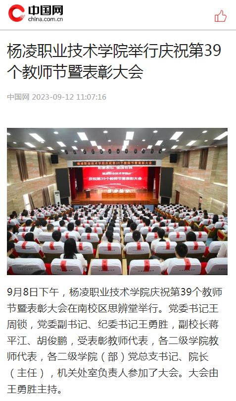 9月8日下午,杨凌职业技术学院庆祝第39个教师节暨表彰大会在南校区思辨堂举行。党委书记王周锁,党委副书记、纪委书记王勇胜,副校长蒋平江、胡俊鹏,受表彰教师代表,各二级学院教师代表,各二级学院(部)党总支书记、院长(主任),机关处室负责人参加了大会。大会由王勇胜主持。