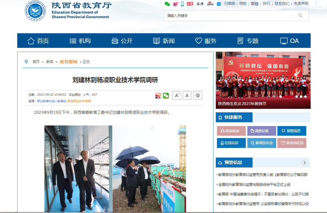 2023年9月19日下午,陕西省委教育工委书记刘建林到杨凌职业技术学院调研。