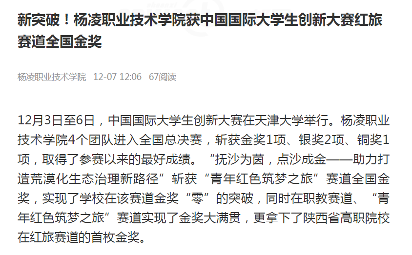 【陕西头条】新突破!杨凌职业技术学院获中国国际大学生创新大赛红旅赛道全国金奖
