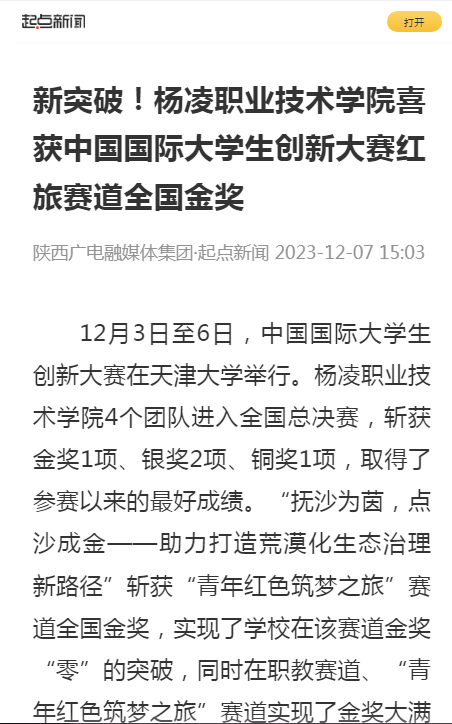 【起点新闻】新突破!杨凌职业技术学院喜获中国国际大学生创新大赛红旅赛道全国金奖