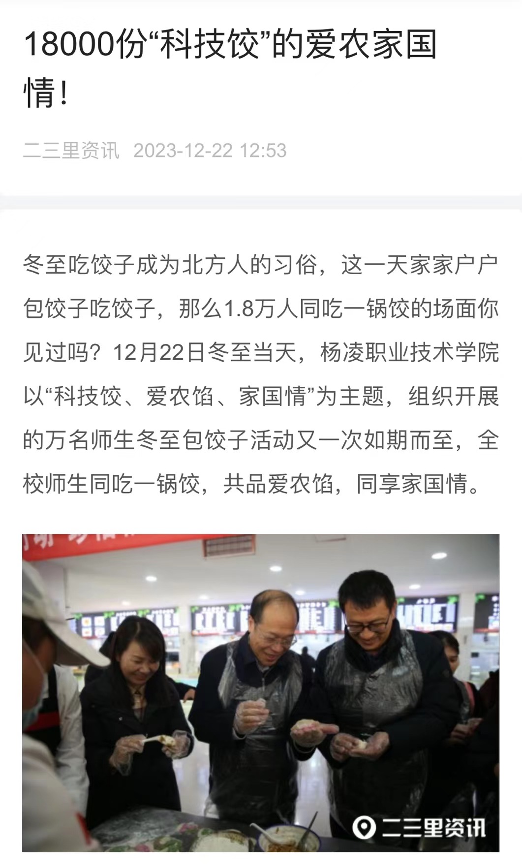 杨凌职业技术学院副校长张朝晖表示,在冬至这个传统节日,学校通过包饺子吃饺子活动,旨在传承和弘扬中华优秀传统文化,更是让学生深刻理解,作为近90年办学历史的涉农院校的学生,要谨记知农爱农情怀,肩负强农兴农使命,为扛稳粮食安全重任,筑牢乡村振兴基石而勤奋学习,将来多出成果服务三农惠及民生。