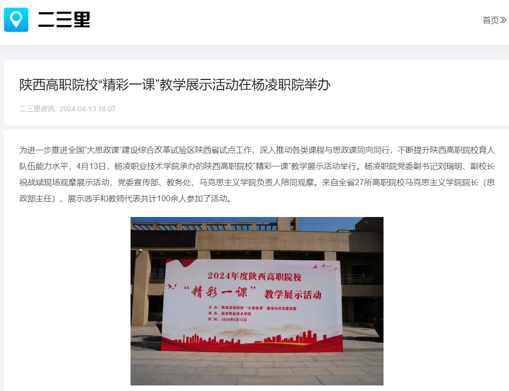 为进一步推进全国“大思政课”建设综合改革试验区陕西省试点工作,深入推动各类课程与思政课同向同行,不断提升陕西高职院校育人队伍能力水平,4月13日,杨凌职业技术学院承办的陕西高职院校“精彩一课”教学展示活动举行。杨凌职院党委副书记刘瑞明、副校长祝战斌现场观摩展示活动,党委宣传部、教务处、马克思主义学院负责人陪同观摩。来自全省27所高职院校马克思主义学院院长(思政部主任)、展示选手和教师代表共计100余人参加了活动。