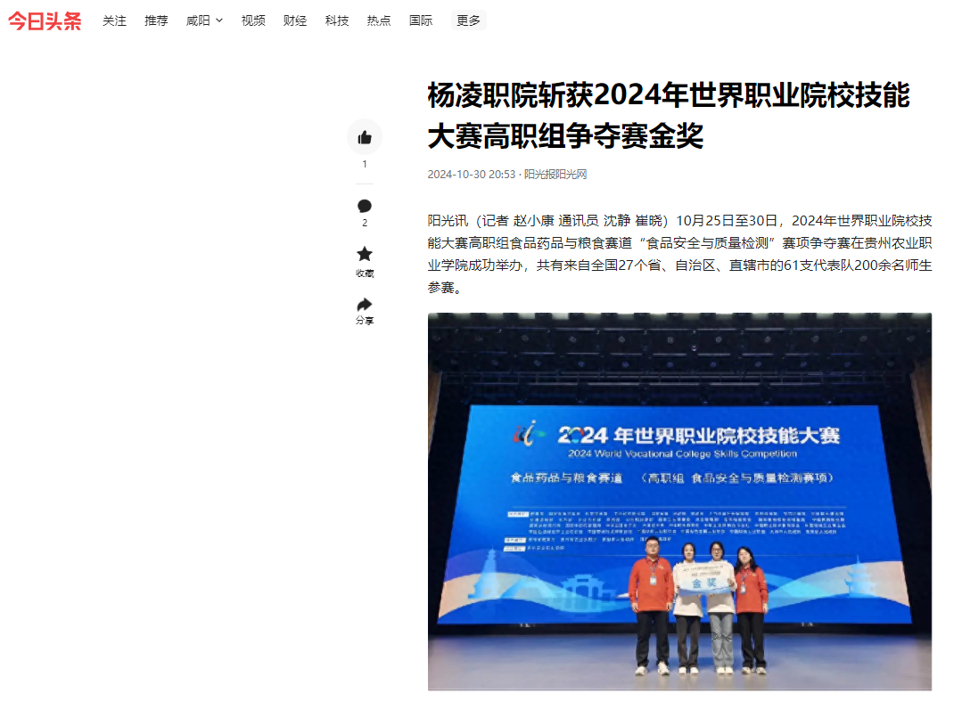 下一条:【群众新闻网】杨凌职业技术学院荣获世界职业院校技能大赛“食品安全与质量检测”赛项金奖