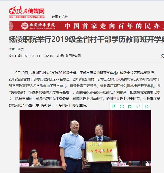 9月10日,杨凌职业技术学院2019级全省村干部学历教育班开学典礼在该院南校区思辨堂举行。2019级全省村干部学历教育班277名学员、2019级洛川村干部学历教育班48名学员和2019级杨陵村干部学历教育班33名学员参加了开学典礼。省委教育工委委员、省教育厅副厅长刘建林出席开学典礼,并向学院授牌“陕西乡村振兴人才培养基地”。省委组织部组织一处副处长刘春泽,杨凌职院党委书记陈宁、院长王周锁,杨凌示范区党工委委员、杨陵区委书记单舒平,洛川县县委书记王明智,省教育厅高教处副处长杨鹏出席开学典礼。开学典礼由陈宁主持。