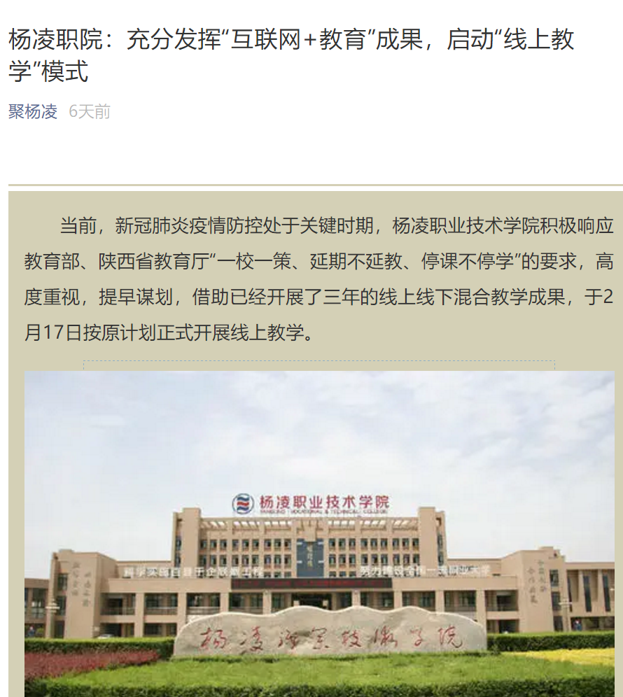 当前,新冠肺炎疫情防控处于关键时期,杨凌职院技术学院积极响应教育部、省教育厅“一校一策、延期不延教、停课不停学”的要求,高度重视,提早谋划,借助已经开展了三年的线上线下混合教学成果,于2月17日按原计划正式开展线上教学。