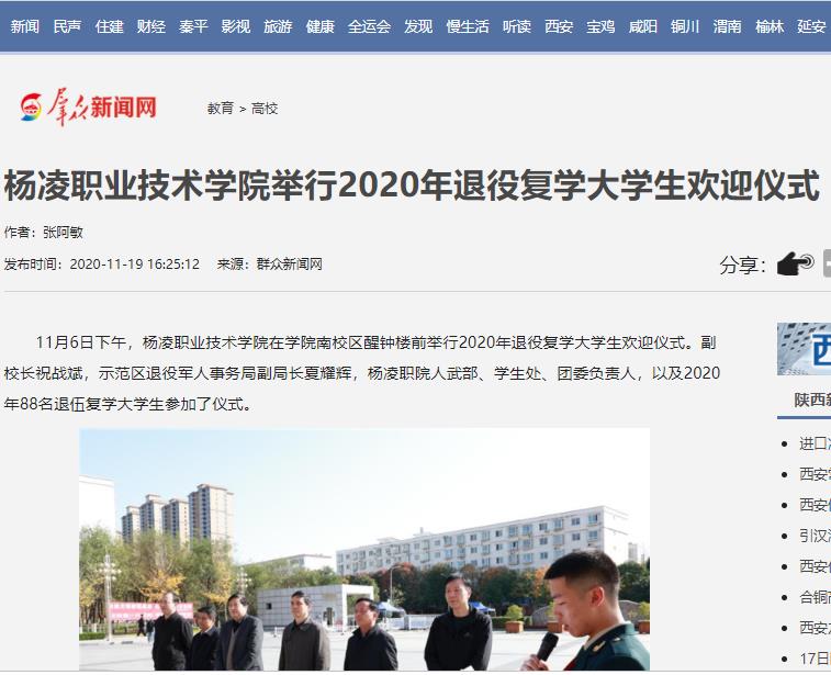 11月6日下午,杨凌职业技术学院在学院南校区醒钟楼前举行2020年退役复学大学生欢迎仪式。副校长祝战斌,示范区退役军人事务局副局长夏耀辉,杨凌职院人武部、学生处、团委负责人,以及2020年88名退伍复学大学生参加了仪式。