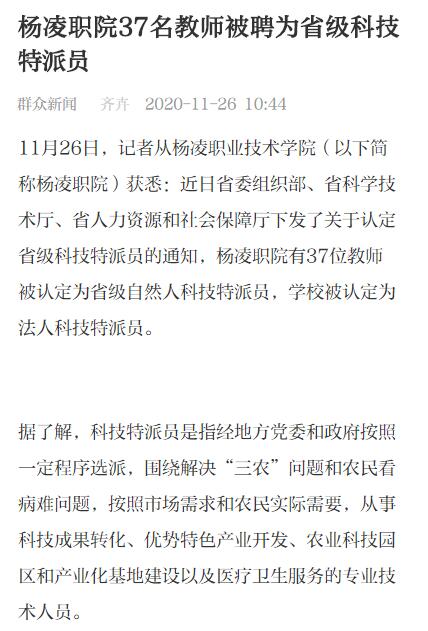 11月26日,记者从杨凌职业技术学院(以下简称杨凌职院)获悉:近日省委组织部、省科学技术厅、省人力资源和社会保障厅下发了关于认定省级科技特派员的通知,杨凌职院有37位教师被认定为省级自然人科技特派员,学校被认定为法人科技特派员。