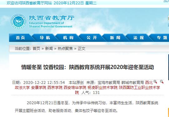 【杨凌职业技术学院】该院在冬至日举办万名师生集体包饺子活动,使广大师生在包饺子、吃饺子的过程中,了解冬至传统文化习俗,体悟学院精神,把知农爱农的饱满热情转化为强农兴农的责任担当。2020年,万名师生冬至包饺子活动的主题为“科技饺、爱农馅、家国情”。科技饺,即本次活动使用的面粉是著名小麦育种专家、该院研究员赵瑜老师培育的小麦品种武农986,既饱含着赵瑜老师的心血,又是现代农业科技成果。爱农馅,作为一所具有86年办学历史的涉农高校,各位师生在吃饺子的同时,要有爱农情怀,始终肩负起强农兴农的使命。家国情,冬至是中华民族的传统节气,在该院这个大家庭中,为广大师生带来热腾腾的饺子,是对中华优秀传统文化的传承,也是学院对师生们的祝福。中午11时许,虽然室外寒气袭人,但该院南、西、北三个校区的餐厅里却一直热闹非凡、浓香四溢,每个橱窗前都有师生陆续拿着红、绿、蓝色餐券排队等候,也有的师生已经吃上了热气腾腾、美味可口的饺子,大家有说有笑,心里暖融融的。中午12点,该院党委书记陈宁,院长王周锁,西北农林科技大学党委副书记闫祖书,以及该院党委副书记任得元,党委副书记、纪委书记刘粉莲,副院长祝战斌也分别来到三个校区的餐厅,与师生们一起吃饺子、过冬至。从学习到生活,领导们与学生们亲切交谈。大家一边品尝自己亲手包的饺子,一边拉家常、聊学习、谈生活、话冬至,欢声笑语随着饺子的香味弥漫在整个餐厅里。此次活动,该院共向全院师生免费发放1.5万份饺子,每份饺子数量为30只,有猪肉香菇饺、猪肉芹菜饺、猪肉大葱饺、韭菜鸡蛋饺,牛羊肉饺等多种口味,这些饺子都是学院领导和师生们提前共同包好的。同时,为了保证此次活动的饮食安全,所有饺子馅所用的大肉都是学院后勤保障处集中招标采购的,鸡蛋和蔬菜也由平常给学院配送的商家供应。活动结束后,师生纷纷表示,此次活动既使广大师生感受到了学院如家的温暖,增强了大家对“冬至”这一节气文化的认识,也培养了学生学农、知农、爱农,献身于农的意识。