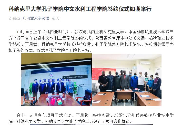 在致辞中,王周锁表示,杨凌职业技术学院培养了众多水利专业人才,在非洲很多中国参与的水利工程建设中发挥了重要作用。三方联合开展中文水利工程教育合作项目,可进一步促进中几教育交流与合作,分享两国高等教育与科技发展成果,为中几两国友谊再添新花。特别是在中文教育与水利专业技术教育相结合,对促进中文职业技术教育在非洲发展,具有特别重要的意义。
