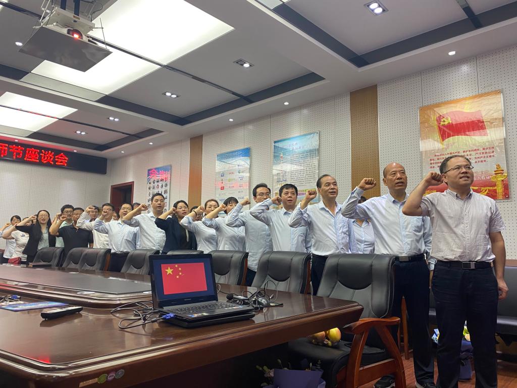 最后,在陈高锋副院长的带领下,所有教师面向国旗,重温人民教师誓词。