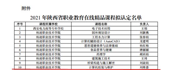 2022年1月28日,陕西省教育厅发布2021年陕西省职业教育在线精品课程认定结果,我院刘维嘉副教授负责的《计算机组装与维护》课程获评2021年陕西省职业教育在线精品课程,实现了我院省级精品在线开放课程零的突破。